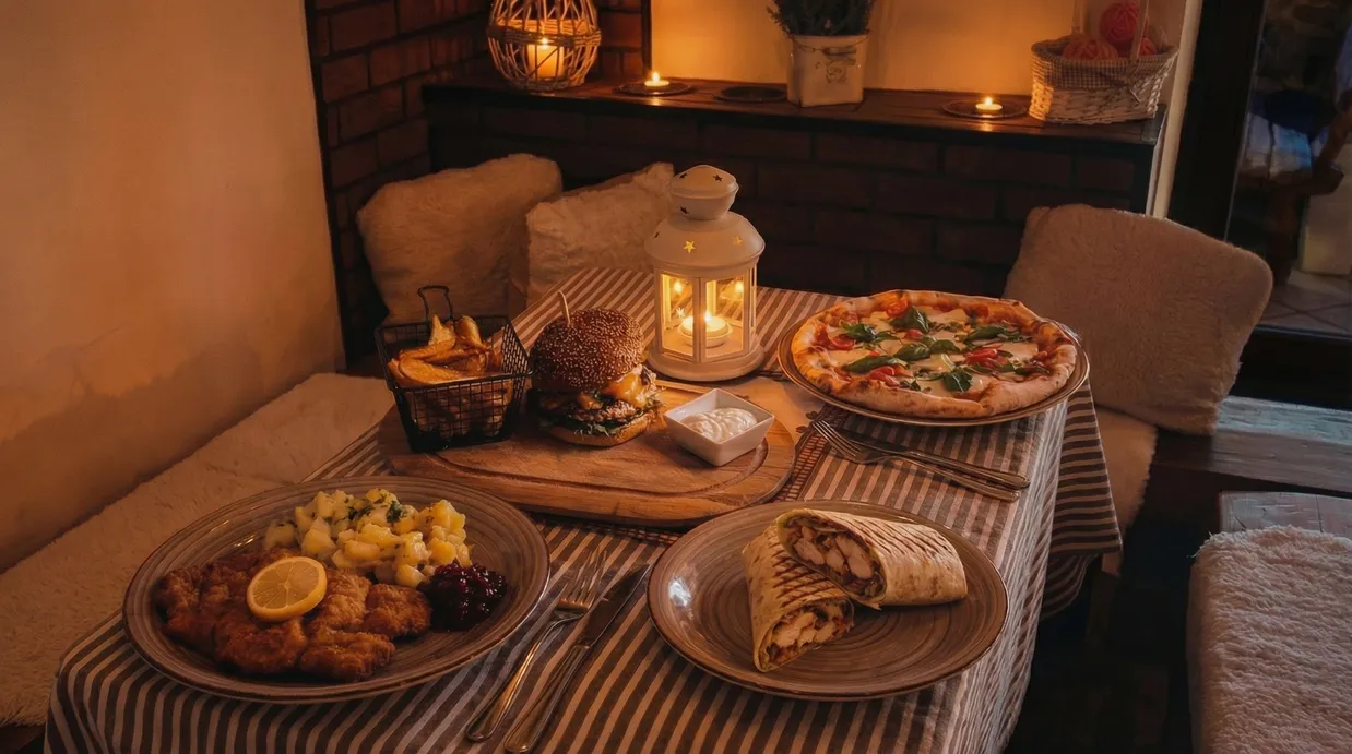 Poctivá domácí kuchyně plná chuti. Šťavnaté burgery, čerstvé wrapy, voňavé bramboráky a křupavé pizzy připravované naším šéfkuchařem. Přijďte si pochutnat k nám nebo si objednejte jídlo pohodlně až domů.
